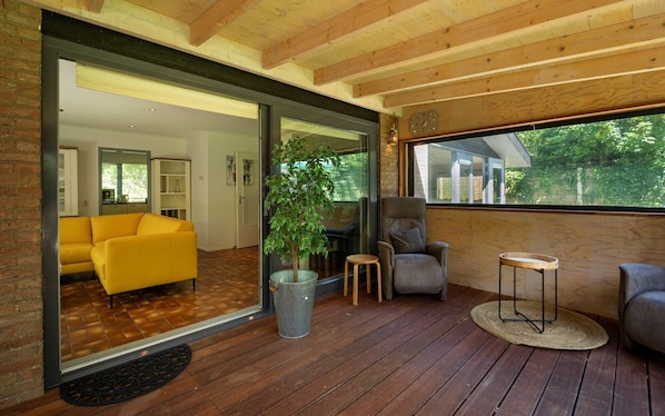 The beautiful, large and very private garden is completely fenced and therefore perfect for your children or dogs to play in. A garden hose with sprinkler is available so you can rinse off your dogs after a day at the beach. The grass is always green here, thanks to the beautiful artificial lawn, which gave this house its name. There is a large terrace where you can enjoy the sun. You can bring your bicycles and store them in the shed. The house has a carport where you can park two large cars.