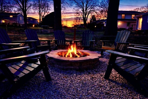Follow the path a few steps farther and you’ll reach one of the home’s most memorable spaces: a 14-ft luxury fire pit area strung with warm café lights. Gather around the 4-ft wood-burning fire pit, roast marshmallows, pour a glass of wine, and settle into deep conversation. A complimentary bundle of firewood is provided for every stay. Located just 5 minutes from charming Downtown Overland Park, 20–25 minutes from Arrowhead, Kauffman, CPKC Stadium, Children’s Mercy Park, and 20 minutes to Downtown KC, the home offers unbeatable convenience for sports trips, concerts, city exploring, and family adventures. And with a park and full basketball court only 0.2 miles away, kids and adults can get outside with ease. Sleeping up to 13 guests, this home blends luxury, warmth, and thoughtful amenities to create a stay that goes far beyond a place to sleep. It’s a place to reconnect, recharge, and truly enjoy time together. Your Kansas City memory-maker awaits.