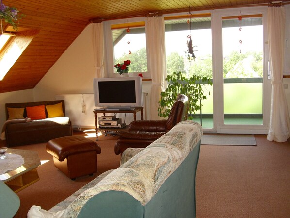 • Apartment, approx. 80 m² living space • max. 4 adults and 2 children (up to 16 years) • Living room • 2 bedrooms • Kitchen • Shower / WC • Dishwasher • WLAN • Loggia • Garden for use • Parking space • Bicycle storage • incl. Sheets and towels • pets not allowed