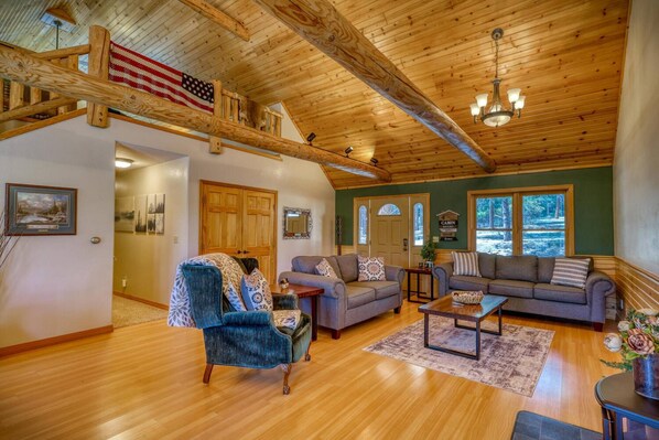 Liberty Lodge is a delightful cabin and is nestled amongst the pine trees on a hillside overlooking the rolling valley of the Holiday Acres Neighborhood. As you enter the home, you are greeted by an open floor plan of the living room, dining room, and kitchen. To the left is the living room with comfy seating, and directly ahead is the dining room featuring outdoor views. To the left of the dining room is the full kitchen, ready to whip up meals with your family. The kitchen leads to the utility closet and laundry room.