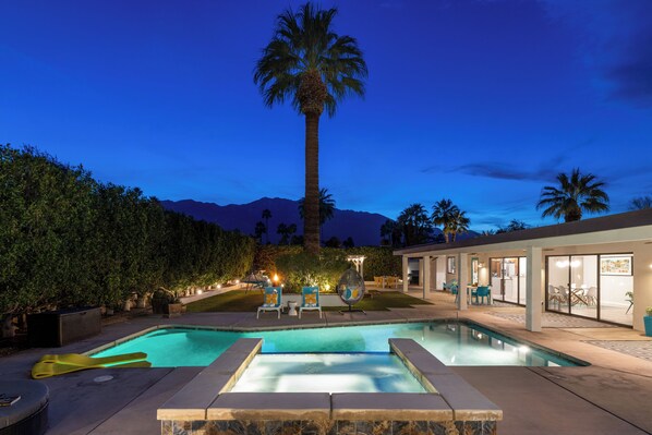 The private backyard captures the magic of Palm Springs living with panoramic views, resort-style amenities, and plenty of room to relax and play. On one side, a shimmering saltwater pool with waterfall spa invites sun-drenched afternoons on chaise lounges or the cabana-style daybed. On the other, a shaded pavilion offers alfresco dining, a cozy fire pit lounge, and space for sunset cocktails under glowing desert skies.