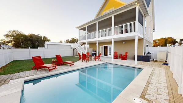 Outdoor pool, shower, fireplace with a Weber BBQ Grill