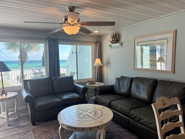 The view is the very best part of this condo. It is actually on the beach with nothing but sea grass and palm trees between your back porch and the Gulf. The place was beautiful, very clean, nicely decorated and welcoming. We had everything we needed and were very comfortable. We will be back!