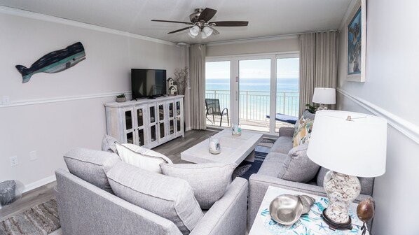Step into the open-concept living area, where soft coastal tones, a flat-screen TV with cable/DVD, and a queen-size sleeper sofa invite you to unwind. Sliding glass doors lead out to your private balcony, the perfect place to sip morning coffee, watch seagulls soar, or enjoy a spectacular Gulf Coast sunset.