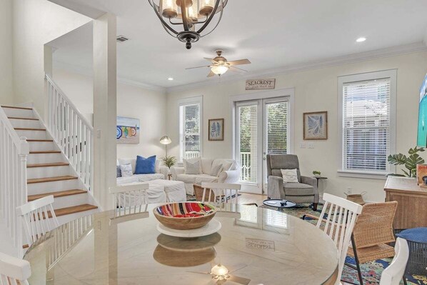 You will go coconuts over this recently transformed beach vacation home. Nestled conveniently between Rosemary Beach and Alys Beach in the idyllic Seacrest Beach neighborhood, Coconut Cottage is a spacious 5-bedroom, 2360 sq ft home perfect for adult groups or families with kids. Cozy up in our open concept living and dining area with ample seating and prepare your favorite meals in our fully stocked kitchen with brand new appliances! Enjoy the fresh breeze on any of the 5 outdoor patio spaces, including a huge courtyard for dining al fresco or lounging. There are a total of 4 king sized beds in the house, plus a bunk room, with 7 smart TVs mounted throughout, and master suites on both the 1st and 2nd level. The 3rd floor lands on a loft space featuring a daybed with a pull-out trundle, bistro set, a wet bar, and a guest suite with another king-sized bed.