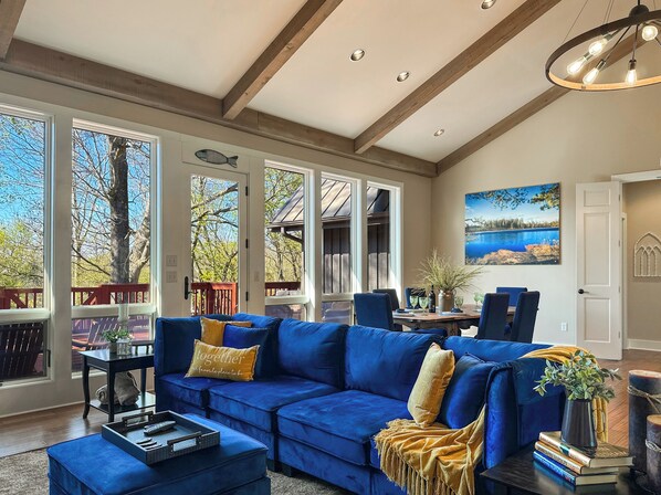 From the vaulted ceilings to the striking wood- burning fireplace, the living space at Riverfront Bliss is warm and welcoming. The wall of windows lets gorgeous light in all day and provides gorgeous views from every angle. And with the open concept layout, guests are able to stay connected while prepping meals, dining or sitting in the living room.