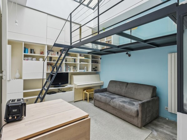 The flat has a welcoming main room with a comfortable sofa bed, a television for your evenings of relaxation, a well-stocked library and a piano for music lovers. A cosy dining area and an open-plan kitchen, equipped with everything you need for cooking (hob, microwave, kettle, storage cupboards), invite you to prepare your meals at home. A mezzanine sleeping area adds a touch of originality.