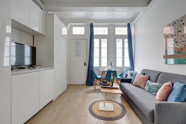The living area features a welcoming lounge equipped with a double sofa bed, a television, and a dining area, ideal for relaxing or sharing a moment together after a day exploring Paris.