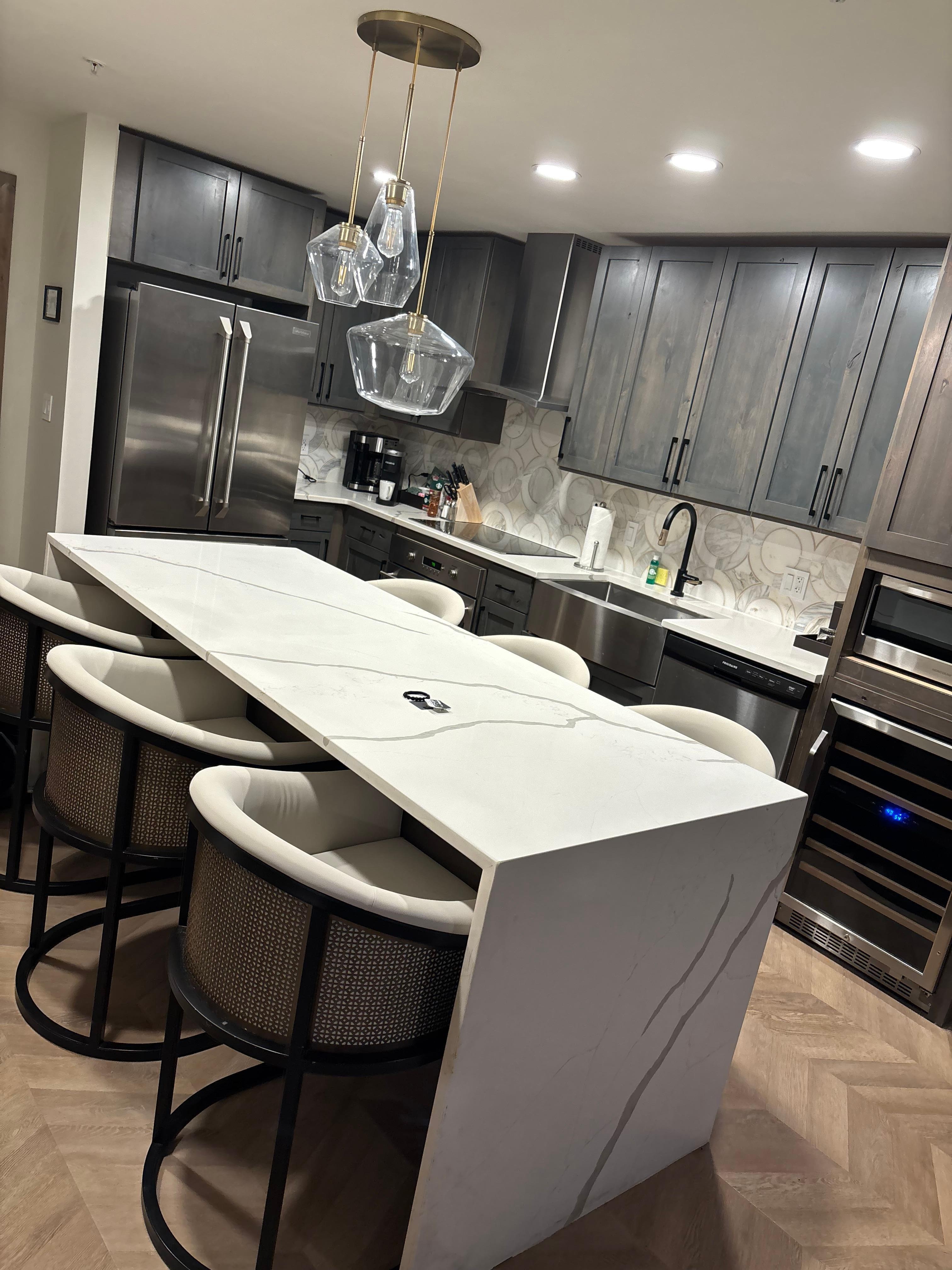 The chefs kitchen features a gorgeous cascading quartz center island for your dining pleasure and stainless appliances.