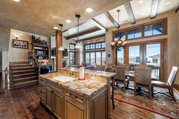 The living area is a breathtaking oasis of comfort and style, adorned with expansive windows that frame captivating vistas of Canyons Village. Gather around the inviting fireplace for cozy evenings, complemented by a state-of-the-art flat-screen TV that promises entertainment and relaxation. Sink into the embrace of luxurious leather armchairs and a sumptuous sofa, creating an ambiance that effortlessly balances relaxation and sophistication.