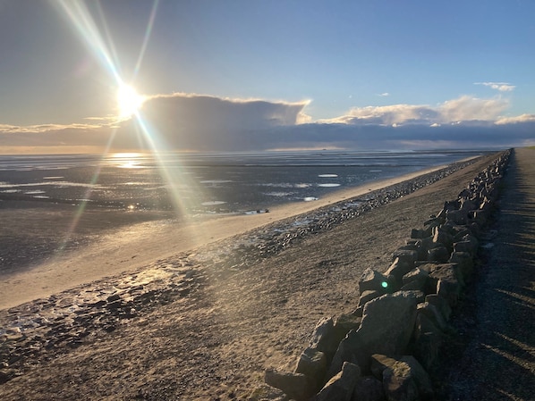 Holiday home with three apartments on the North Sea island of Pellworm. Welcome to our beautiful mound in the heart of Pellworm. Our well-kept thatched house exudes tradition and Frisian charm, offering you a stunning panoramic view. When you see the lighthouse lights, you know your holiday has begun! The tastefully and individually designed apartments invite you to relax and feel at home. Here you will find everything you need for an unforgettable stay for two: comfort, coziness, and plenty of peace. Explore the area or simply unwind. The house is set on a mound, about 600 m from the road, in a very quiet location. The "Leuchtturm" beach, spa and health center, swimming pool, harbor, and Edeka supermarket are about 2.5 km away.