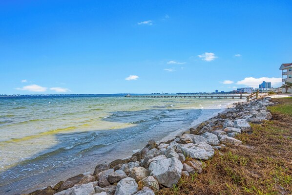 Located steps away from the water, you can relax while listening to the sound of waves from your private balcony overlooking Pensacola Bay, or take a short walk across the street to enjoy the beautiful white sands and emerald green water of the Gulf of Mexico. This second floor unit