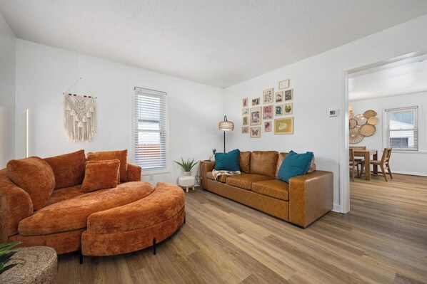 Spacious main-level living room (family room) with plenty of seating and a smart TV for guests to use their own streaming apps