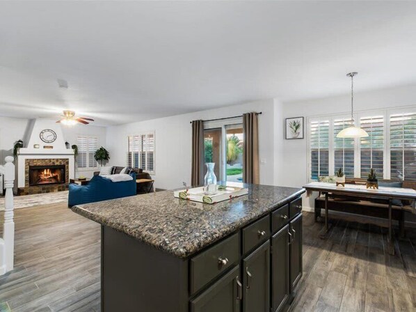 Large kitchen with eat-in dining area, living room, and backyard seating areas. A fully stocked laundry room, hair dryer, iron & ironing board, and vacuum cleaner are also available.