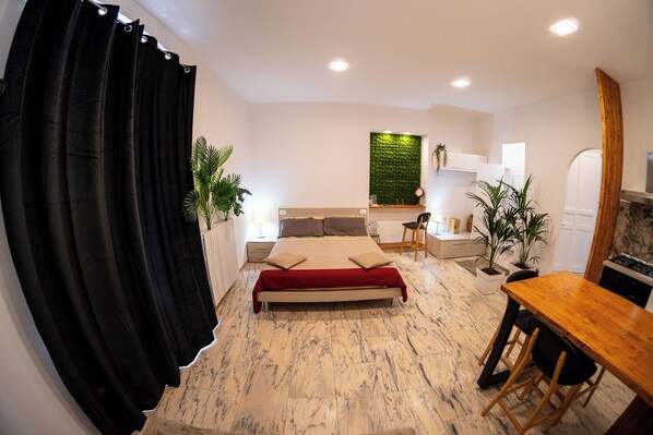 It consists of a garage (where booking is possible to park cars of medium size, the entrance door is 212 cm wide) on the ground floor, a studio loft on the first floor and a second apartment with both bathroom and kitchen autonomous.
