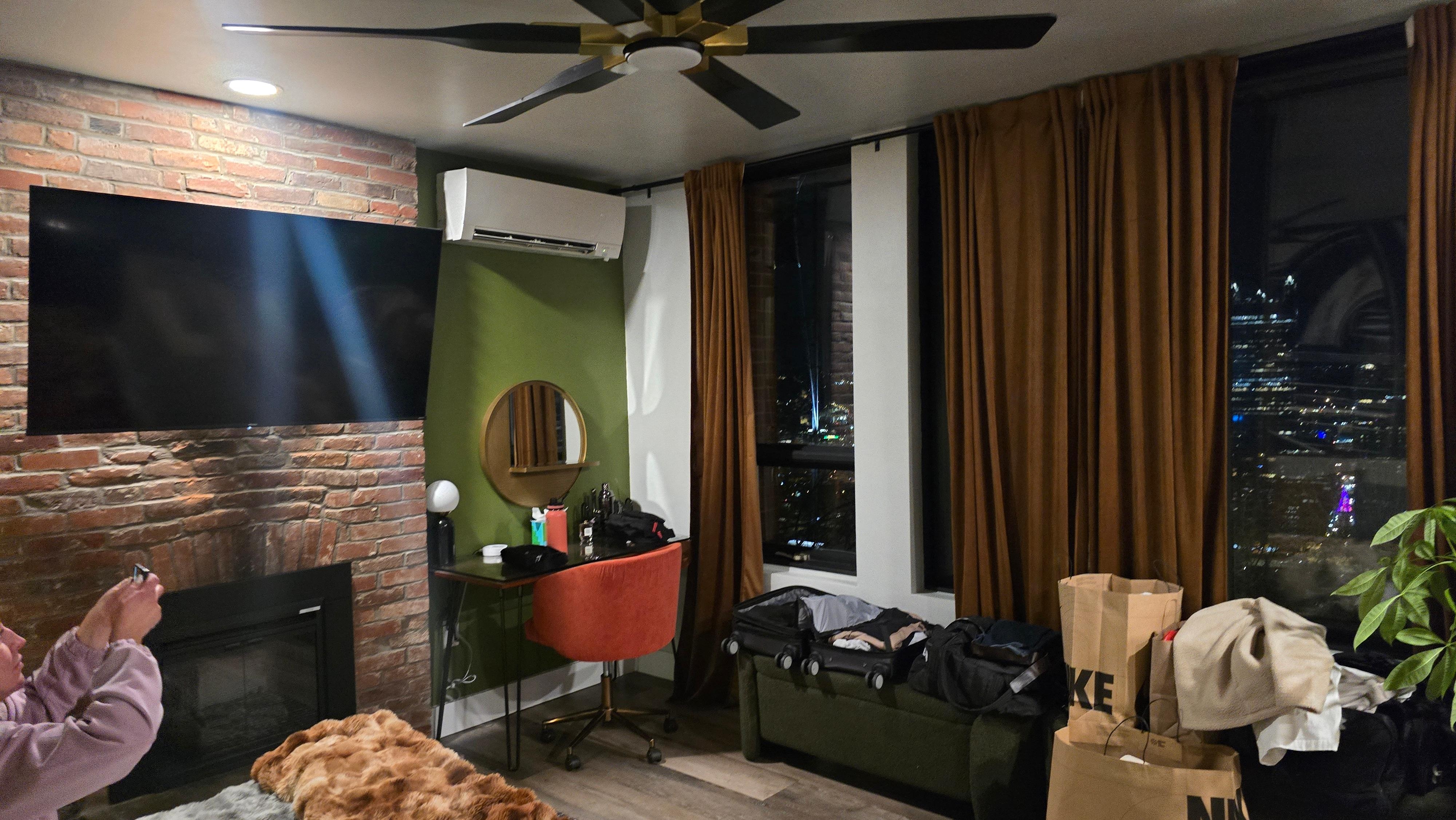 ✓ Entertainment – 65” Roku Smart TV + cozy electric fireplace