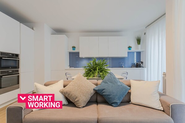 The apartment is on the mezzanine floor and the entrance opens onto the bright living area with a sofa, a TV, a dining table and an open-plan kitchen equipped with amenities including a dishwasher, an oven and an espresso coffee machine. From here there is access to the small terrace furnished with a dining table. The sleeping area, on the other hand, consists of two bedrooms, both equipped with a queen-size bed, a TV and large closets. A bathroom with shower completes the layout.