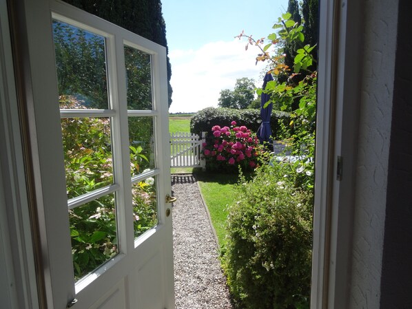 In the beautiful garden each Ferienwohnug has a separate seating area with garden furniture, barbecue and parasol. The guest sits in the midst of flowering plants and fruit trees.