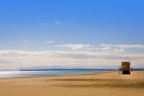 Perto da praia, espreguiçadeiras