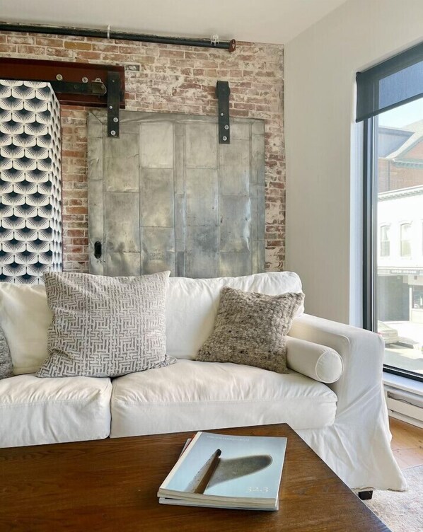 As you enter, you’re greeted by a warm and inviting space. The exposed brick and hardwood floors add a touch of history, while modern furnishings and appliances create a comfortable and stylish atmosphere. You’re drawn to the spacious living area with floor-to-ceiling glass overlooking Congress Street. It’s the ideal place to relax with a cup of fresh brewed coffee or your favorite glass of wine and watch the world go by. Your fully equipped kitchen is perfect for whipping up a snack using the freshest seafood from the local purveyor down the street.