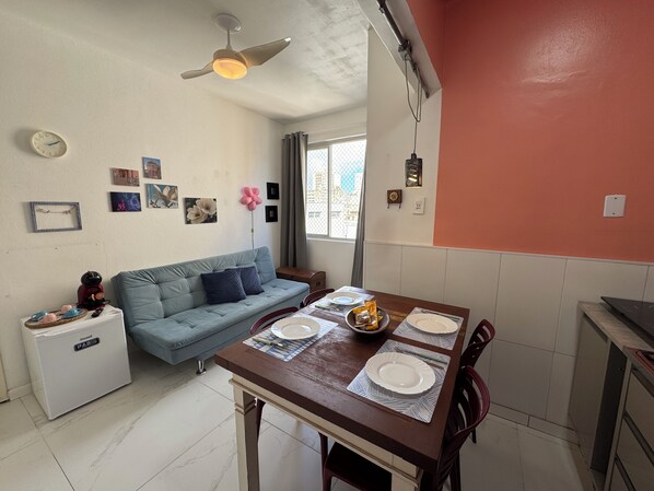 Sofá-cama de casal muito confortável, mesa 4 lugares, cafeteira Nespresso, ventilador de teto, tv smart com Netflix, Youtube, 14 canais locais em alta definição.