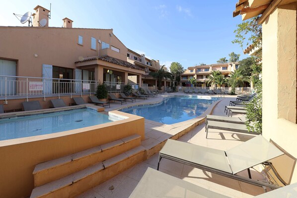 O local oferece piscina externa e piscina infantil.