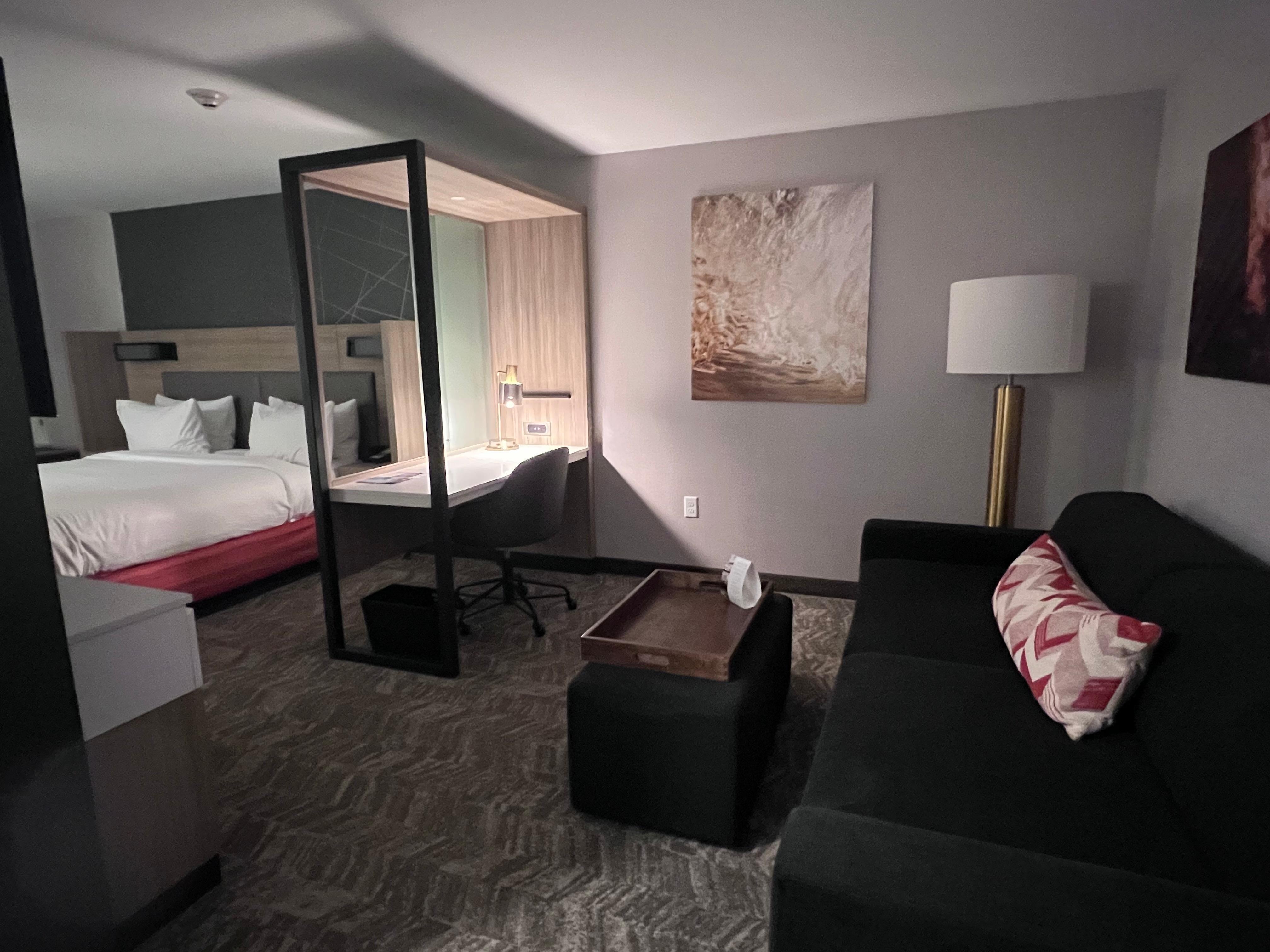 Beautiful space. Spacious room. Comfy furniture. Desk space incredible. Bathroom huge.