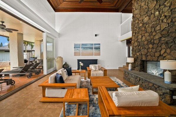 True to Hawai'i style, the indoors meet the outdoors in this contemporary home, with a nod to mid-century modern architecture offering modern island living. Guests will love the rich, beamed wooden ceilings and the stunning two-story lava stone fireplace as the living room's centerpiece. Vaulted ceilings in the living room allow for an open and dramatic space where guests can gather in the airy seating area. Open the sliding doors to expand to the covered lanai, or keep them closed and enjoy the A/C. In the den/media room, guests can watch a favorite show on the wall-mounted flat screen, or tuck away for a quiet workspace. The second level has an additional common area with a sofa, TV, and workstation. The lower level has an inviting open flow between the living space, lanai, dining area, and kitchen.