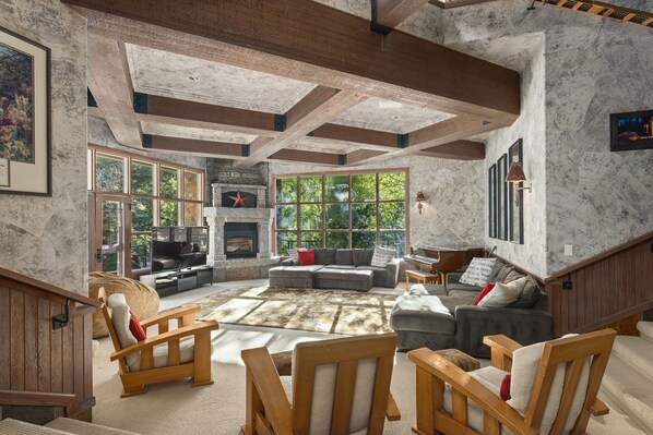 Se finalmente se cansou, está na hora de se preparar para a noite. Escolha um dos 12 quartos distribuídos por todos os níveis da casa. Passe uma noite luxuosa enquanto relaxa na sua banheira privada e se aquece junto à lareira do seu quarto, antes de apagar as luzes. Depois de acordar ao som do riacho ali perto, terá mais um dia de aventura e lazer pela frente. Desfrute do pequeno-almoço na cozinha ensolarada ou relaxe no deck exterior da sua escolha. As mesas de jantar e de cozinha acomodam confortavelmente até 21 pessoas. Perca-se a explorar as infinitas delícias da casa, que incluem uma escada em espiral que leva a dois quartos escondidos, uma caixa de areia sombreada e baloiço ao ar livre para crianças, relvados espaçosos para refeições e reuniões ao ar livre, dois beliches, música bluetooth, Alexa, 3 ecrãs planos TVs, calor radiante em toda a casa, paisagismo requintado, um gerador (que se ligará automaticamente no caso de a casa ficar sem energia) e inúmeras aventuras ao ar livre. Quer esteja a viajar em negócios ou a organizar um retiro empresarial, um mini business center está convenientemente situado no piso principal e está equipado com uma impressora, um quadro branco e uma seleção de materiais básicos de escritório em caso de aperto.