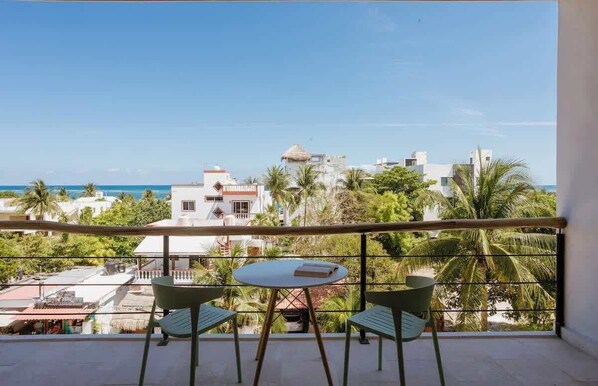 🛏️Deep Rest: King bed with premium sheets & A/C ❄️. Wake up to warm light & enjoy unforgettable sunrises on your private balcony with table ☕.