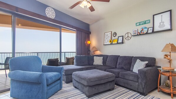 This 2 bedroom unit has a front, ocean facing bedroom made up of a private bathroom. Convenient glass door closets, a King sized bed, and a full sized sleeper sofa as well. Glass block outlines the spacious shower, and there is a double sink vanity.