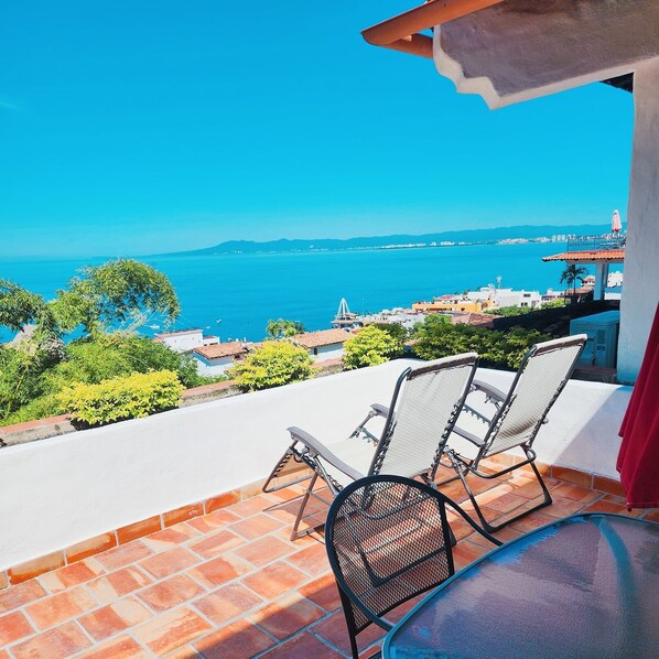 The huge terrace overlooks Banderas Bay and gives you panoramic, stunning views of the ocean. It has a gas-powered outdoor grill on the terrace. Feel like a steak or fish-fry? Light 'er up and enjoy a barbeque'd meal in the magical open air while you marvel at the 2nd largest bay in the Western Hemisphere.