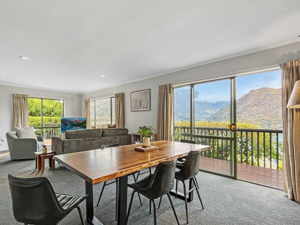 The lower level features an open-plan kitchen, dining, and living area with large windows and balcony access, creating the perfect place to relax after a day exploring Queenstown.