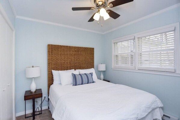 -Bedroom: Rest peacefully in the cozy bedroom, which features a queen-sized bed with a charming woven headboard.