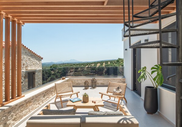 Ground Floor | Living Room ( featuring a 65’’ Smart TV) • Dining area • Fully Equipped Kitchen • Double bedroom with King Size bed (1,80x2,00), 44’’ Smart TV, En-Suite bathroom with walk in shower, access to balcony • A shared WC is also available on the ground floor.