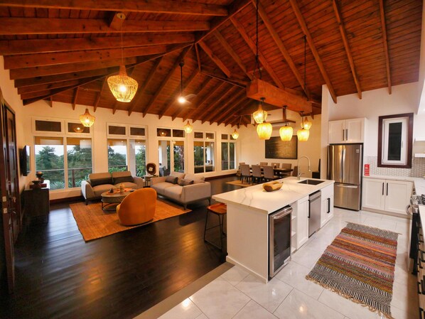 A fully operational open custom kitchen awaits you. Golden ratan lights hang from the hand crafted fixture over the expansive kitchen island. From a simple coffee in the morning as you watch the sun light the Caribbean to a dinner for 10 you will have everything you need to bring your culinary desires to life.