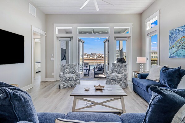 The interior of this home is flooded with natural light thanks to the floor-to-ceiling windows, Whip up delicious meals in the well-equipped island kitchen, complete with stainless steel appliances and counter seating or dine at the nearby table that can comfortably seat eight. After meals, relax in the spacious living area and stream all your favorite TV channels using your own private accounts. This home also includes a private washer/dryer to help you keep your beach towels and swimsuits bright and clean. Sleeping options include two primary bedrooms, one up and one down, both with king sized beds and both have their own private bathroom and shower. The upstairs also includes a kid-friendly bunk room with a twin and full bed and across the hall, a fourth spacious bedroom with a comfortable queen size bed and hall bathroom and bathtub.