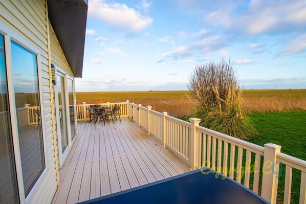 Bright & Airy Living Room – Sink into plush sofas, enjoy a wall-mounted TV, and cosy up by the elegant electric fireplace. Double French doors open onto a full wrap-around decking, perfect for sipping morning coffee or evening drinks. Plus, there`s an inflatable double air mattress for extra guests!