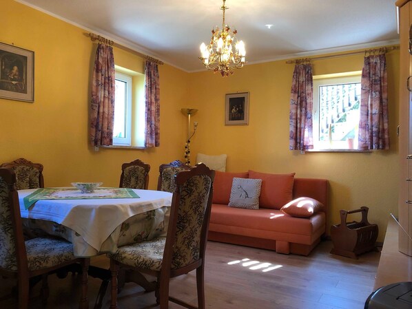 2 room apartment - basementThe apartment consists of a living room with an open kitchenette, a bedroom and a bathroom. In the kitchenette there is a stove with oven, refrigerator with freezer and a sink. Furthermore, coffee maker, toaster, kettle, dishes, glasses, cutlery, wipes and other kitchen utensils are available. The living room has a couch, which can be used for extra bed, a TV with satellite connection, radio, a pull-out dining table with four chairs and a wall unit with plenty of storage space. The bedroom has a futon bed with a high firm mattress, a wardrobe and an armchair. Bed linen is available. Dimensions of mattress: 2,00m x 1,40mThe apartment is located in the basement and has a separate access. The windows are mainly in eastern direction. Bathroom with bath, washbasin, mirror cabinet and toilet; Towels are available. The entire apartment is tempariert with underfloor heating. The outdoor area is always available with table, garden chairs and a solid brick barbecue. In this place, the sun shines in the morning and invites you to a leisurely breakfast.