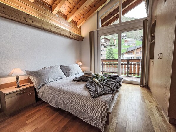 The apartment Allalin boasts a fantastic view of the mountains from the balcony, allowing you to enjoy the picturesque scenery during your stay. Additionally, the balcony furniture provides a pleasant outdoor seating area for relaxation. While the maximum capacity and the number of pets allowed are not explicitly mentioned, the description indicates that the unit can accommodate up to 4 people comfortably, with the 2 double bedrooms and the open living/dining area (just an example).