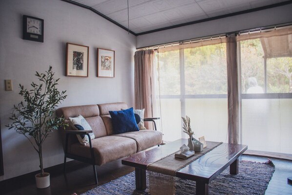 The spacious Japanese-style room, where breezes flow through, offers views of a garden that changes with the seasons, like a painting. Art fills not only the garden but also the interior, including paintings by Shinichi Takahashi, a representative printmaker of Sado, featuring motifs like the Japanese crested ibis and Oni Taiko drums, along with beautifully decorated obi sashes and hanging scrolls. Preserving the charm of a traditional house, this healing space lets you experience Sado's nature and culture through art with all five senses. Accommodates up to 8 guests, making it perfect for family or group stays. Escape the city bustle and indulge in a soothing retreat enveloped by art and nature.