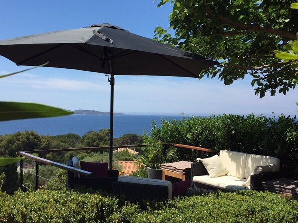 This apartment offers excellent comfort. A main entrance overlooking a small garden with pantry and an entrance through the large bay window opening onto a shaded terrace all day and the 2 levels of gardens on the sea side. A new terrace facing the sea has just been realized (exceptional view on the Cap Corse) The first room also opens onto the terrace and enjoys a superb sea view. It is equipped with a bed of 160 with mattress and box spring new, and a wardrobe closet closet. The second bedroom offers a sofa140 sofa bed equipped with a very good mattress. It is also equipped with a closet/wardrobe and a small desk. The kitchen has a very complete equipment. (Large oven, ceramic hob, microwave oven, dishwasher, refrigerator, Nespresso machine, coffee maker, etc....
