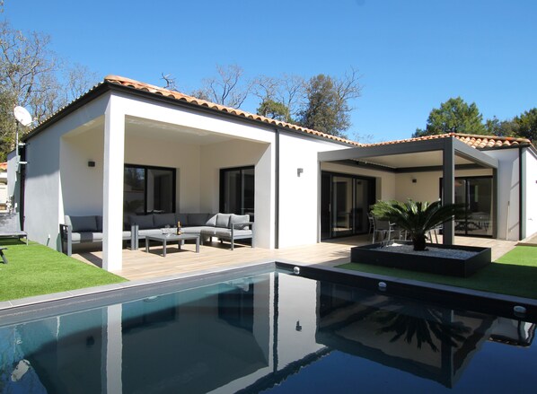 In a quiet cul-de-sac, less than 1 km from Belesbat beach, 500 m from the shops and 50 m from the forest, Les Agapanthes is a large, modern, comfortable house offering exceptional facilities for 8 people.