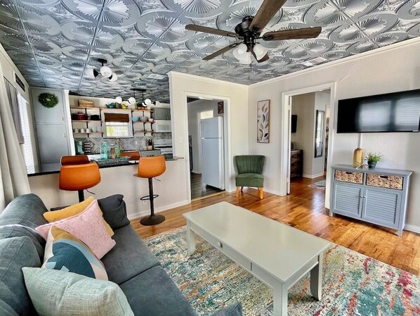 The house, even though older, had been very tastefully renovated and furnished. It was more spacious than the photos. We found it had everything we wanted or needed. It was in a very good location and within short driving distance to points of interest. It was also in a pretty quiet neighborhood. The outdoor patio would have been great but weather made it difficult to enjoy (very hot and humid). Only a couple of cons were an issue. Place could have a bit cleaner, however, our standards are quite high. Actually only REAL downside was that bedding etc was highly fragrant. Due to asthma/allergies this was an issue. Once certain fabric types get scented, the scent can never be laundered out. I would recommend this place unless you have fragrance challenges.