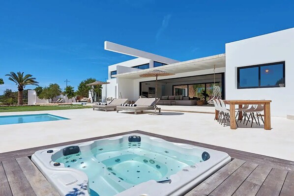 From the moment you arrive, the villa invites you to unwind in a peaceful oasis featuring a 14-meter private pool, outdoor jacuzzi, Mediterranean gardens, and spaces designed for maximum comfort. Just 1 km from the charming village of Sant Joan de Labritja and its famous hippie market, and 7 km from Benirrás beach, known for its sunsets and drumming rituals. The villa offers 8 spacious bedrooms and 8 full bathrooms, all with private terraces and views of the countryside or pool.