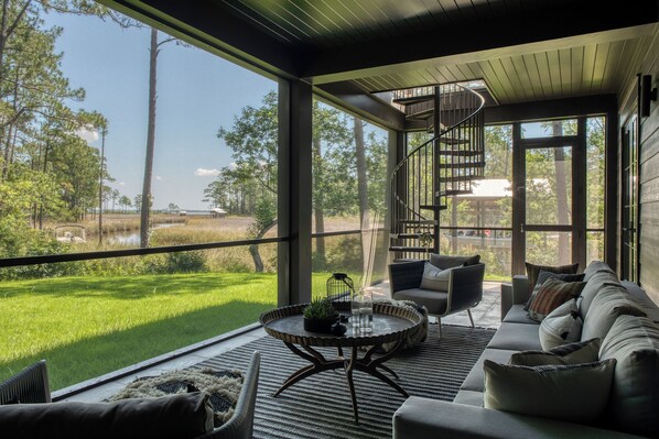 Featuring three beautifully appointed bedrooms and three full bathrooms, this residence in the idyllic area of Pt. Washington offers comfort, elegance, and tranquility. Enjoy peaceful mornings on the spacious screened-in porch and gather around the firepit under the stars, all with breathtaking views across the marsh.