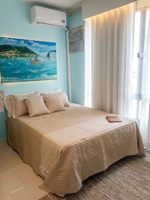Apto completo, Prédio Frente Mar Gonzaga | Garagem | Wi-Fi | 4 hóspedes