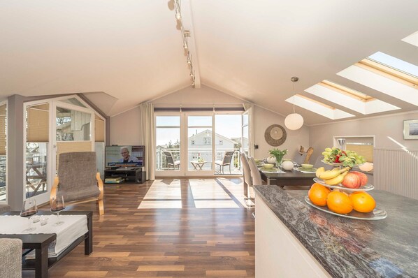 Luxury for the whole family - lake view included - 3-room apartment in the attic, 80 sqm, living room with integrated fitted kitchen, 2 bedrooms, bathroom, storage room, 2 balconies, with Baltic Sea view, underfloor heating in all rooms, internet access Features: Large living room with light View over the old town and directly to the Baltic Sea, with comfortable couch and swing chair, LCD TV (satellite TV), DVD player, compact stereo with radio and CD, high-quality brand kitchen with sophisticated equipment and extra large ceramic hob, extractor fan, separate oven in comfortable operating height, refrigerator, super silence dishwasher, espresso machine, bedroom with double bed (1,60 mx 2 m), LCD TV (SAT-TV) and walk-in closet, bedroom with 2 single beds (each 0,80 mx 2 m) and wardrobe , Extravagant bathroom with large bathtub, walk-in shower, toilet, urinal, hairdryer, cosmetic mirror, towel heater, underfloor heating, Storeroom with wardrobe, shoe cupboard and washing machine, balcony east with partial view to the Baltic Sea, balcony south with direct lake view and view over the Alter Markt balcony equipped with teak furniture and a sun lounger.