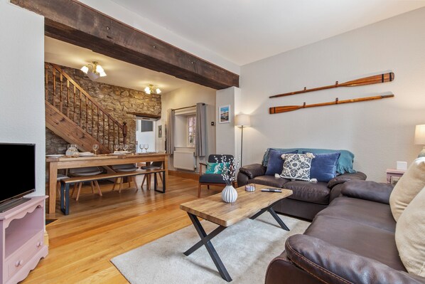 The living area is warm and welcoming with comfy leather sofas around a cosy open fireplace, the perfect place to relax and watch some tv after a long day exploring the coast. The living area has two sofas and a chair to seat five.