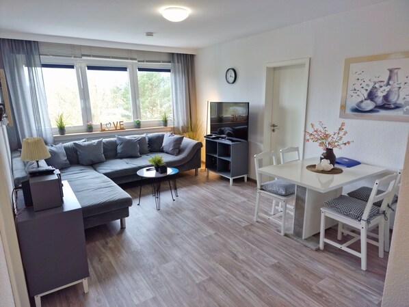 The bright living room is equipped with a large sofa area, dining table with chairs and two dressers with 124 cm flat screen TV, DVD player and hi-fi system. There is also a selection of DVDs, books and board games available in the apartment.